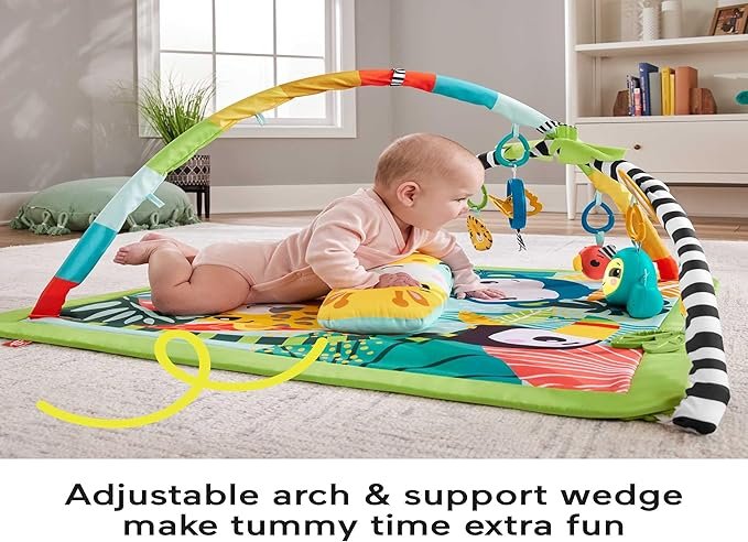 • Encouraging Play: The Fisher-Price Baby Playgym is designed to inspire your child to play, learn, and grow. The rainforest jungle playmat includes five exciting activity toys attached to adjustable arches: a crinkle tiger, rattle parrot, butterfly mobile, BPA-free leaf teether, self-discovery mirror, and a Music & Lights Sloth for added fun.